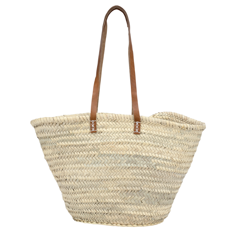 Panier Assia – tressage serré en palme naturelle et longues poignées en cuir. Élégant et pratique pour toutes vos sorties.