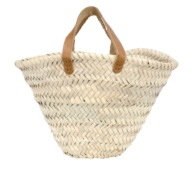 Le panier Tiza est un accessoire compact en palme naturelle avec des poignées en cuir, parfait pour la décoration ou comme petit sac d’appoint