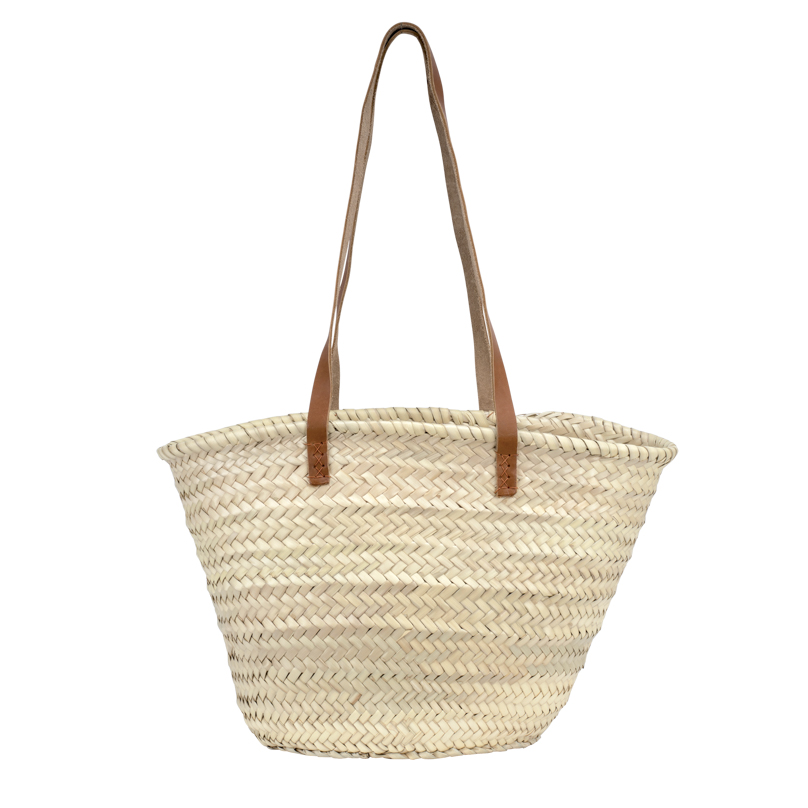 Panier Nala – tressage serré en palme naturelle et longues poignées en cuir. Élégant et pratique pour toutes vos sorties.