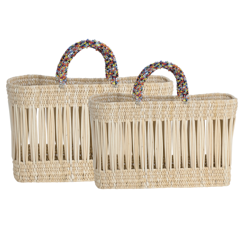 Panier en jonc Lulla avec anses perlées multicolores, idéal pour un usage quotidien ou comme élément décoratif. Artisanat authentique.