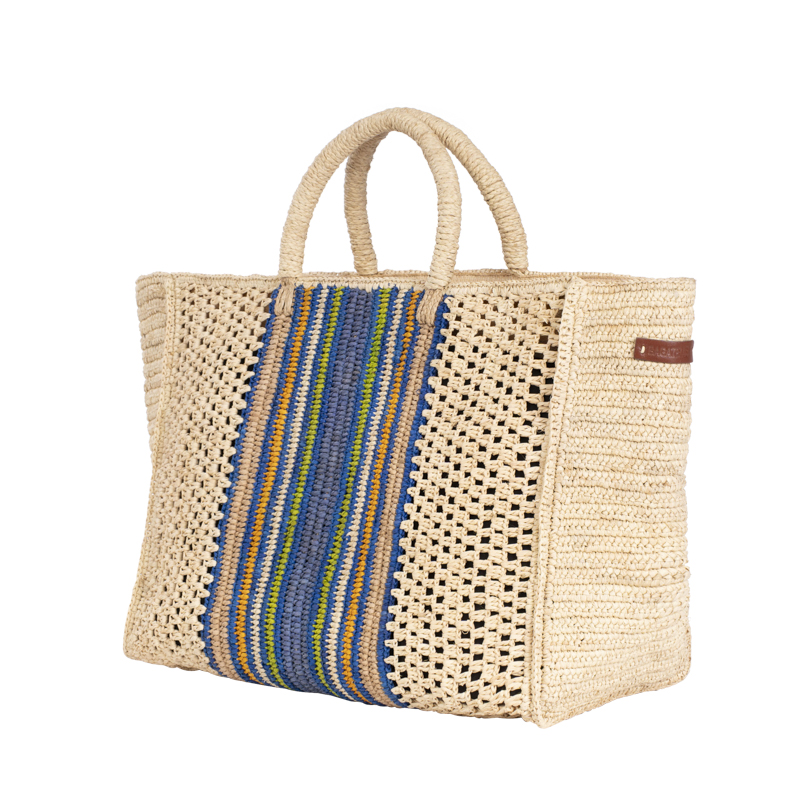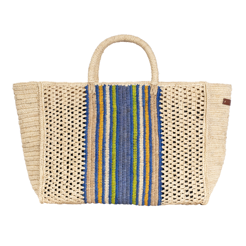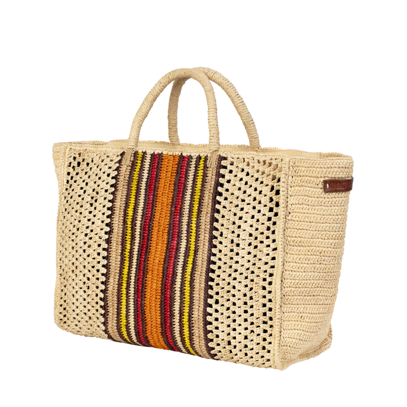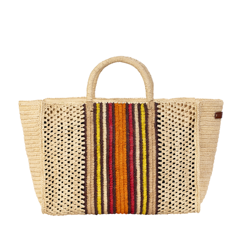 Sac Soko en raphia avec larges rayures multicolores et côtés ajourés, parfait pour un style estival dynamique.