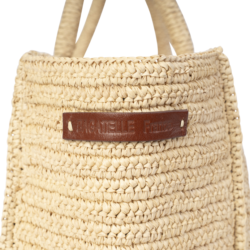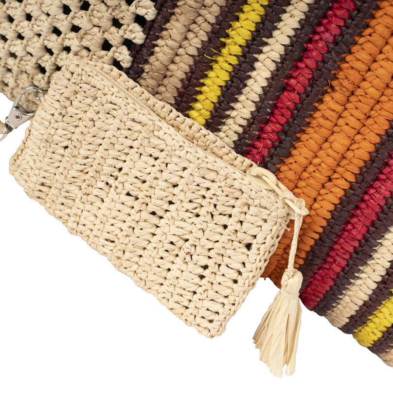| Caractéristiques | Raphia crocheté, anses raphia, fermeture zip, pochette amovible |