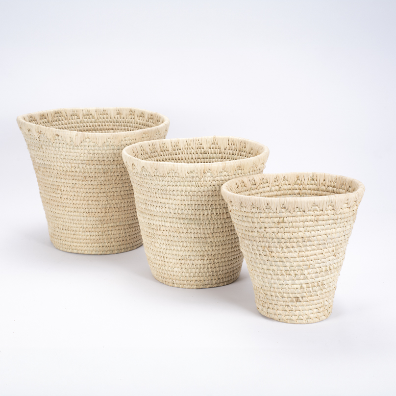 Ensemble de trois cache-pots Hazo en raphia naturel, parfaits pour ajouter une touche artisanale et chaleureuse à votre décoration intérieure.