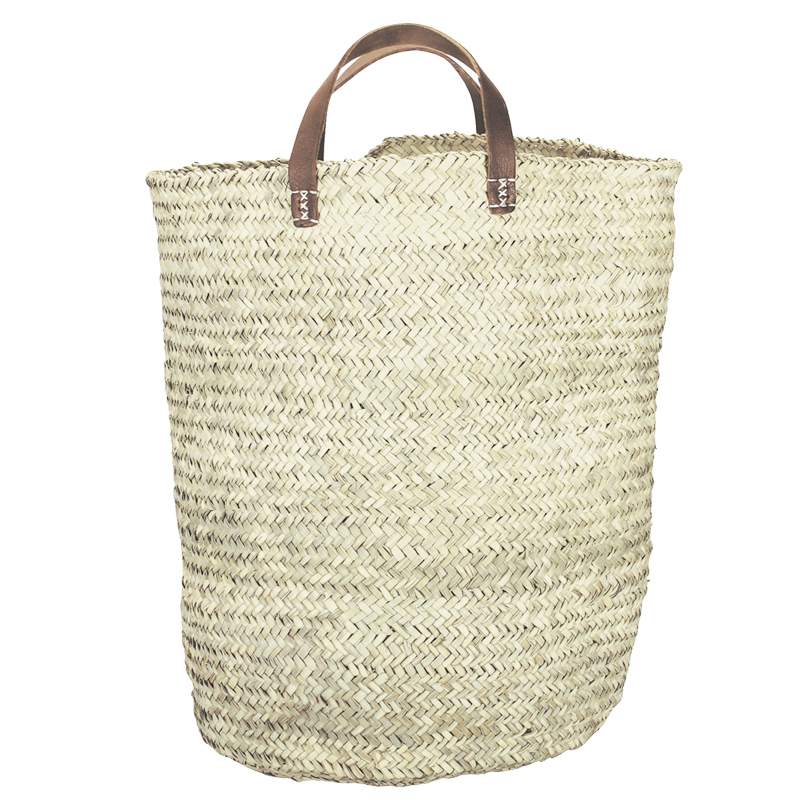 Grande corbeille Nyala en palme naturelle avec poignées en cuir. Idéale pour le rangement ou la décoration intérieure. Durable et élégante.