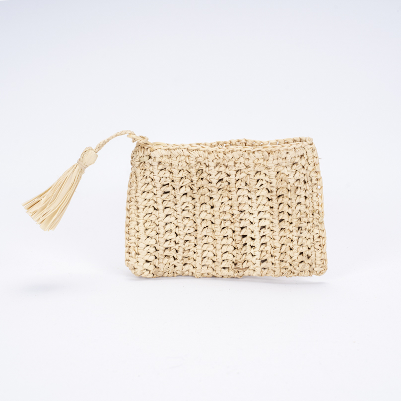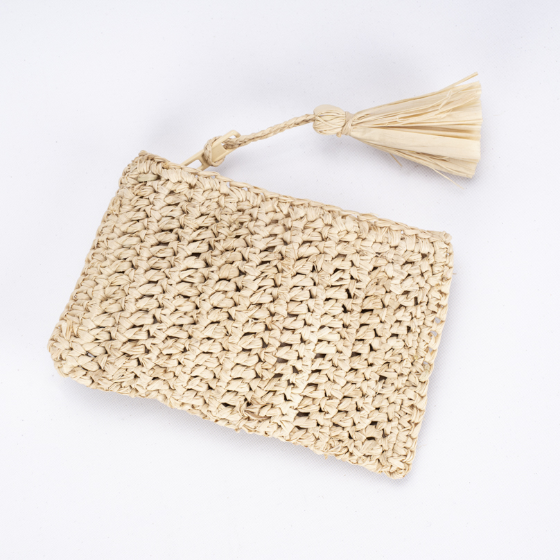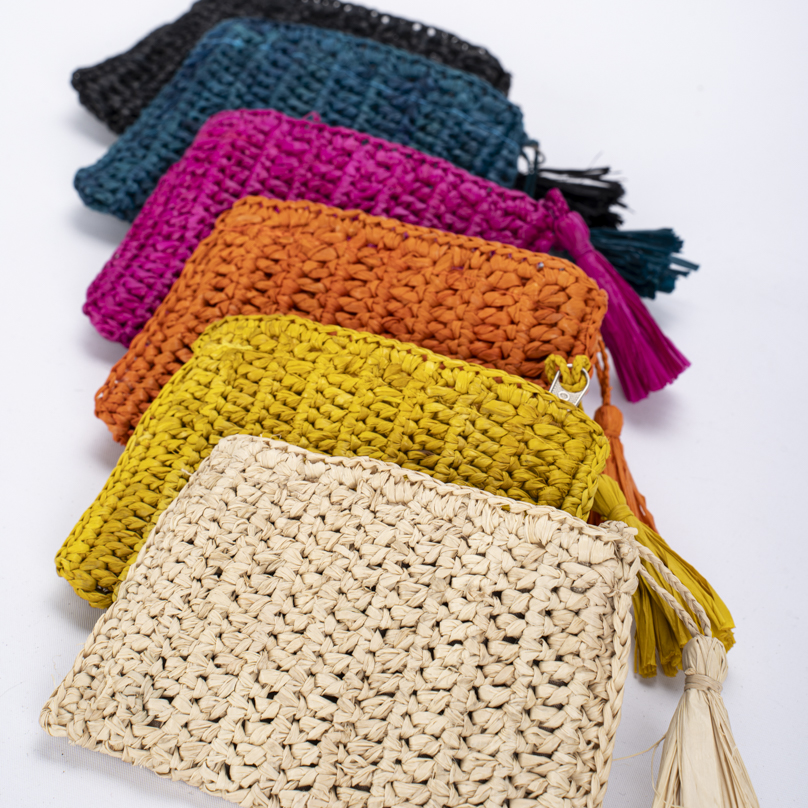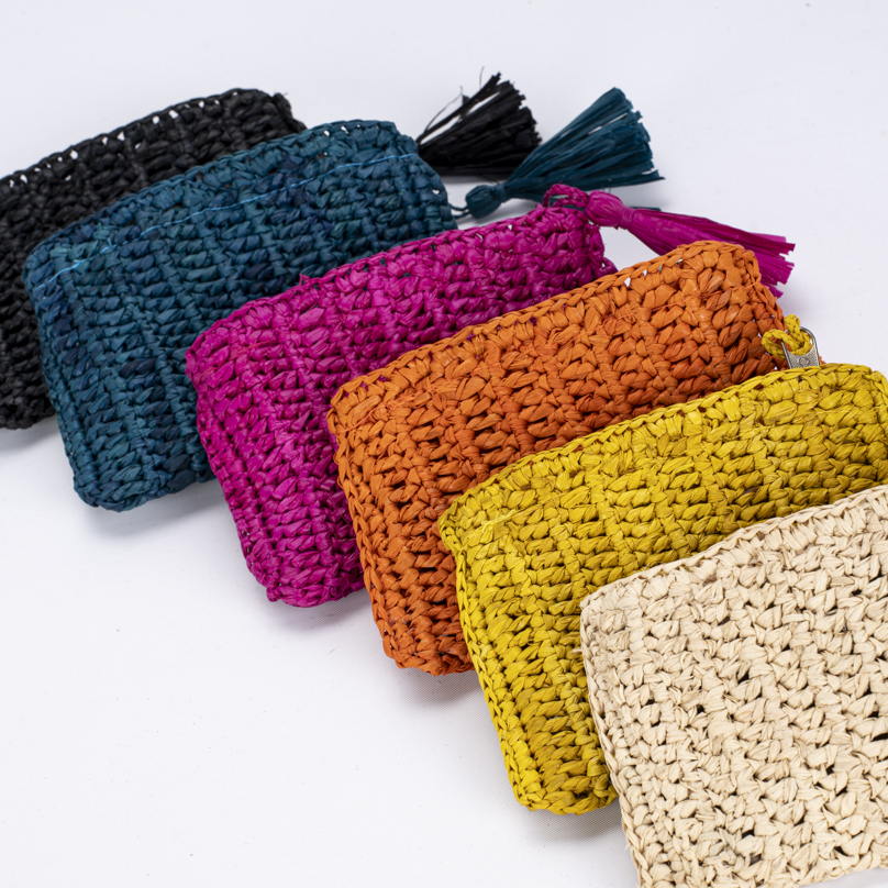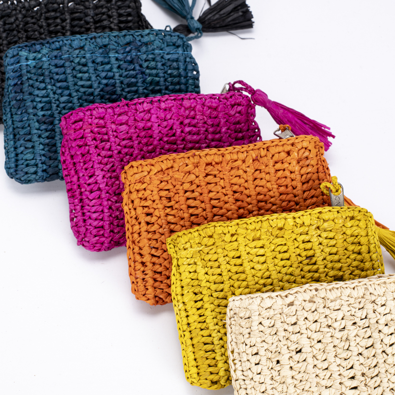 Porte-monnaie Wapi en raphia crocheté, disponible en plusieurs couleurs vives. Compact et pratique pour vos petites affaires.