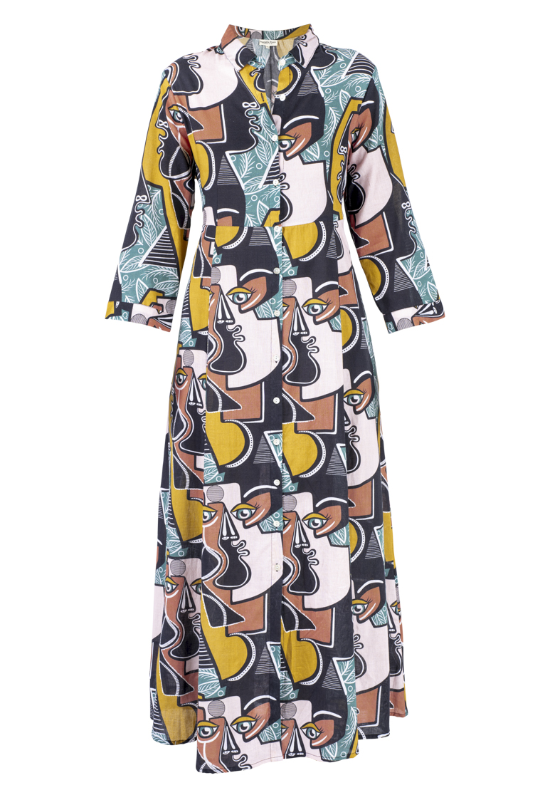 Robe longue boutonnée et évasée. Col italien. Manches trois-quarts.