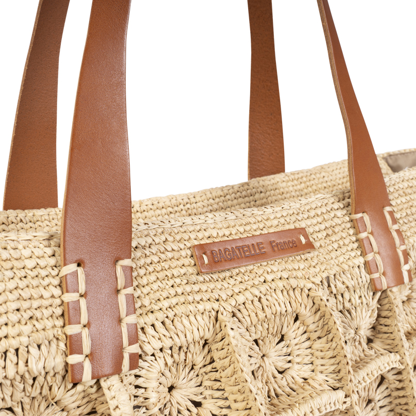 | Caractéristiques | Raphia crocheté, anses cuir, fermeture zip, doublure intérieure |