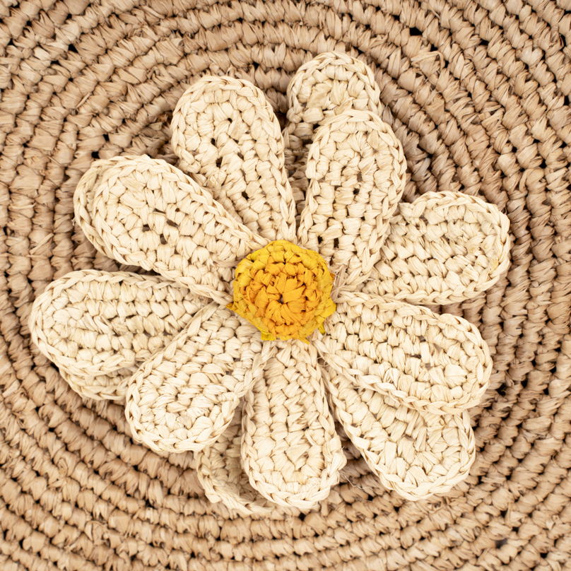 Le sac crochet Kombi, avec sa forme circulaire et son motif de fleur en crochet, allie élégance et originalité pour un style estival chic.