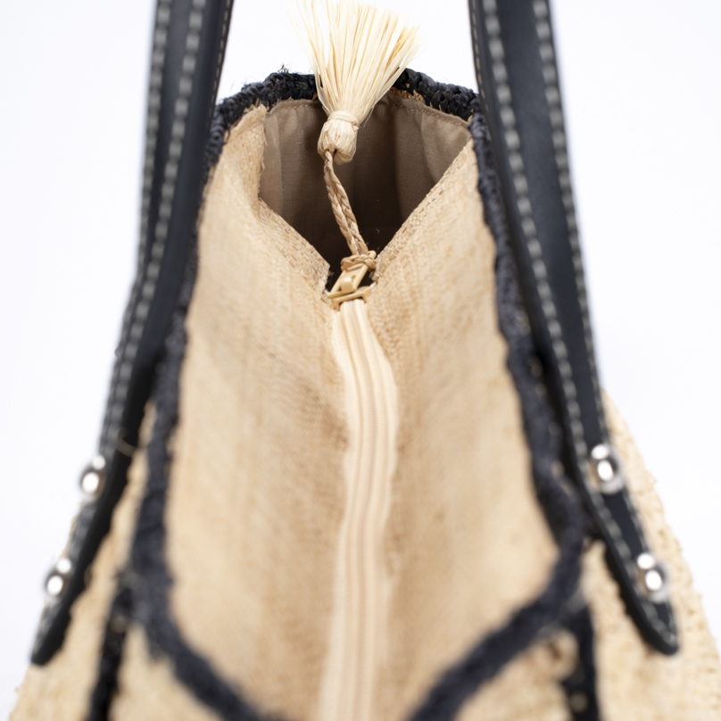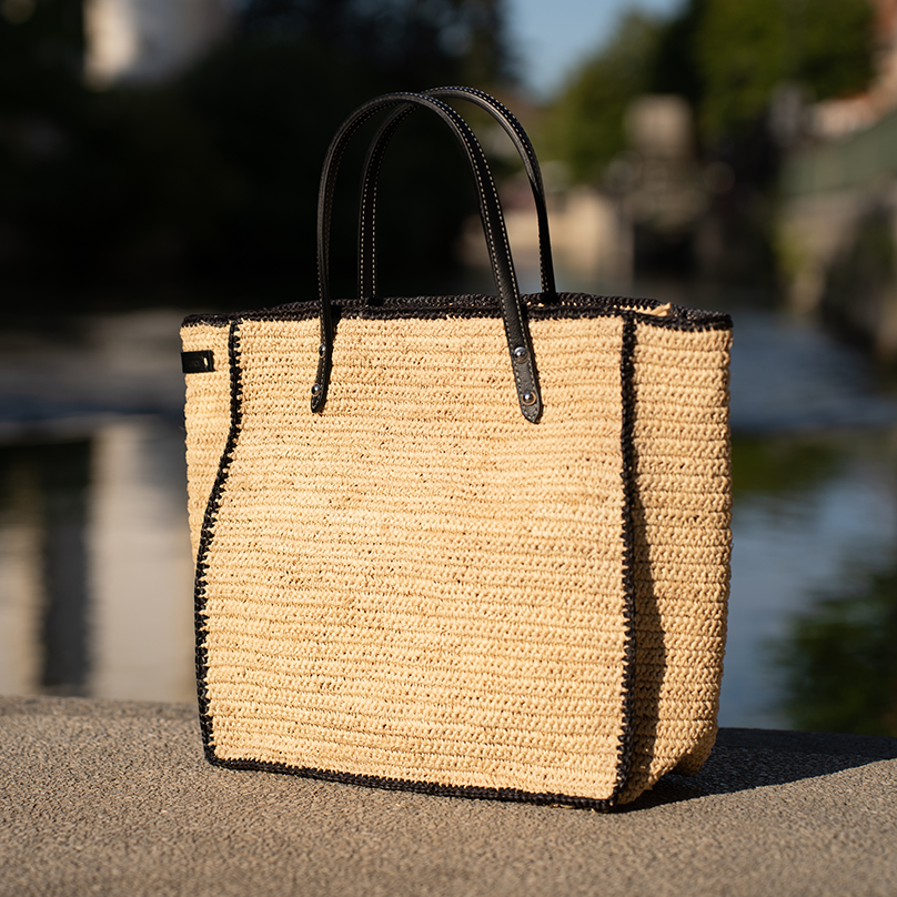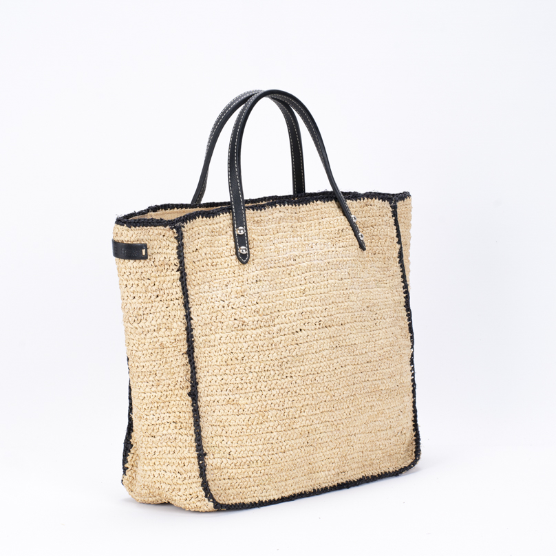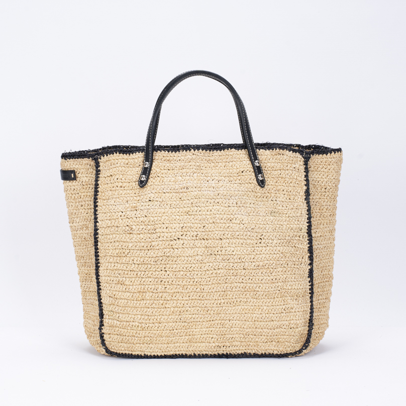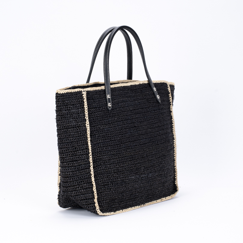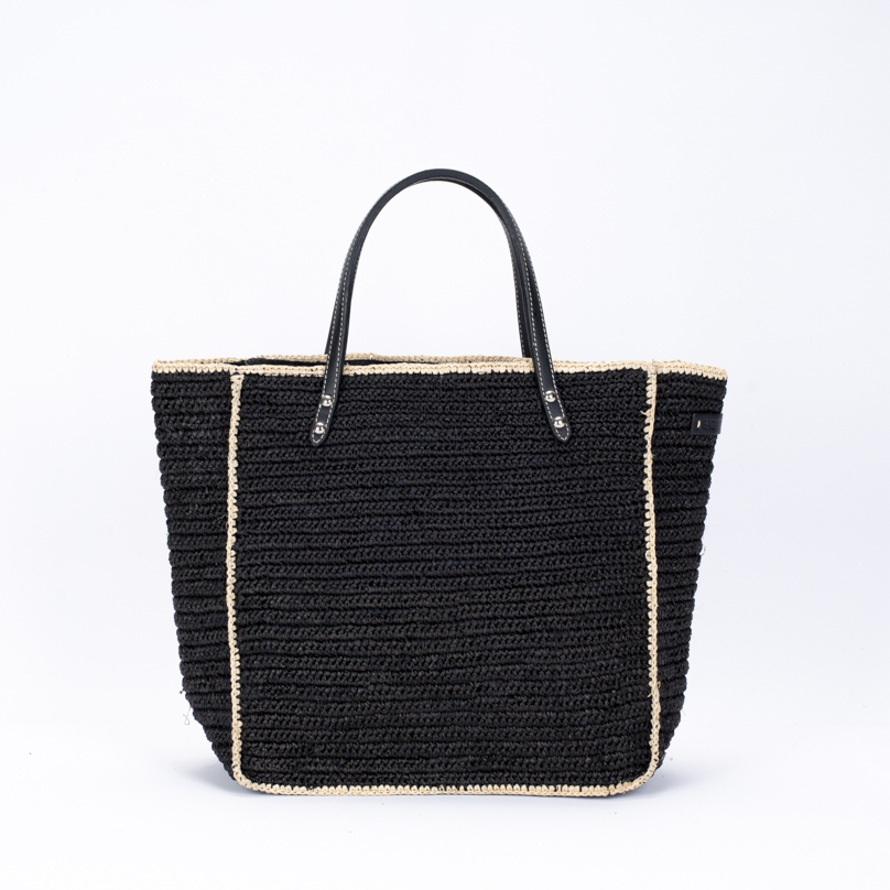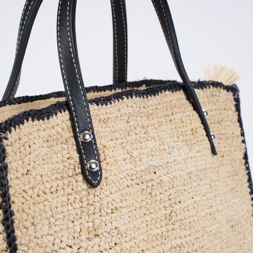 | Caractéristiques | Raphia crocheté, anses cuir noir, fermeture zip, doublure intérieure |