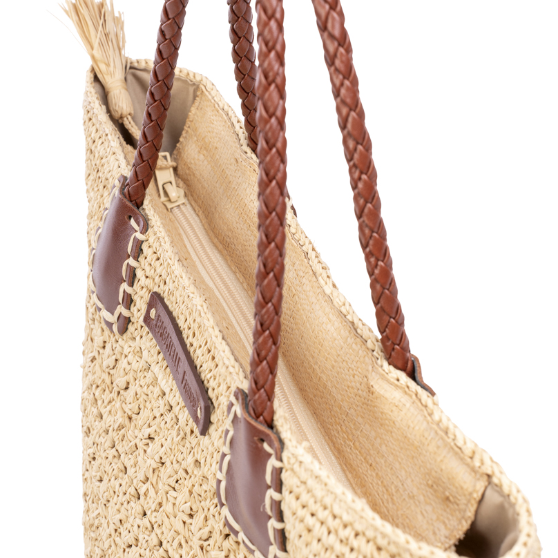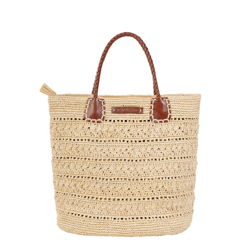 | Caractéristiques | Raphia crocheté, poignées cuir tressé, fermeture zip, doublure intérieure |