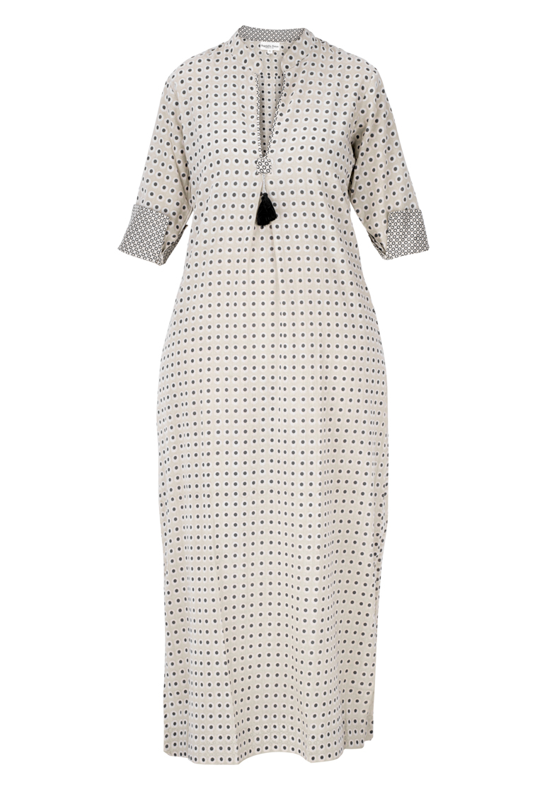 Robe droite longue. Manche trois-quarts avec revers coloré. Pompon en perles et tissu au niveau du décolleté. Col en V.