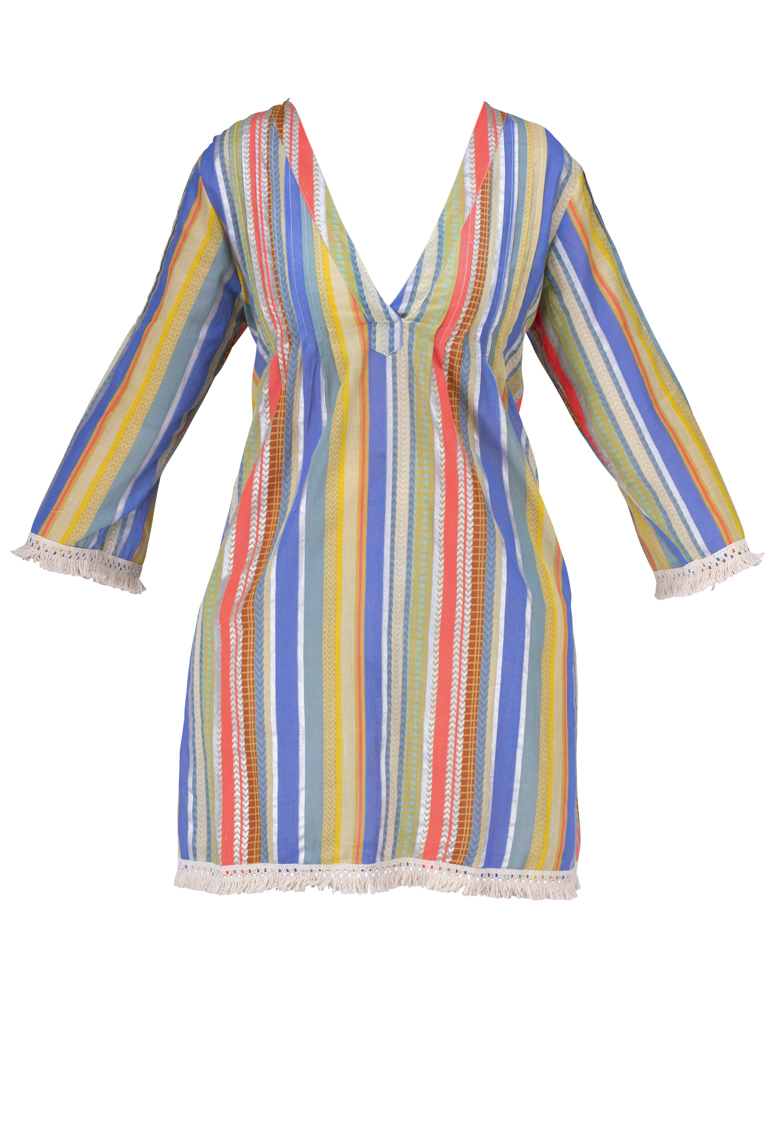 Robe droite. Col en V. Galons sur les manches et le bas de robe.