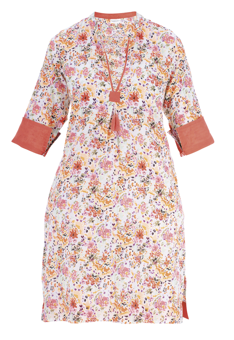 Robe mi-longue avec manches trois-quarts et revers coloré. Pompon en perles et tissu au niveau du décolleté en v.